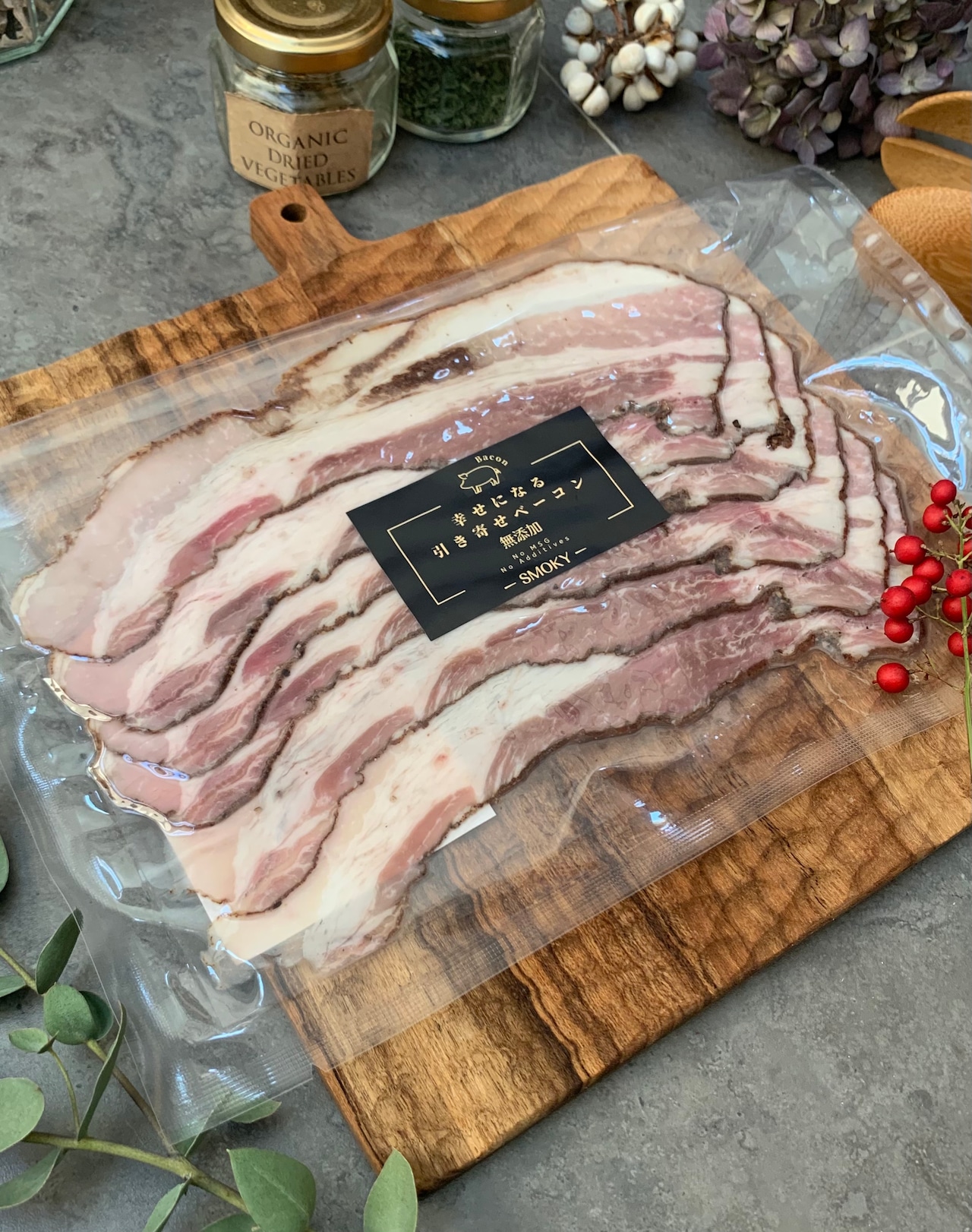 プレーンやスモーキータイプよりも、脂身が少なくハムのようなベーコンです。そのままパンにのせたり、サンドイッチやサラダにもお使いいただけます。スモークの良い香りはそのままです。