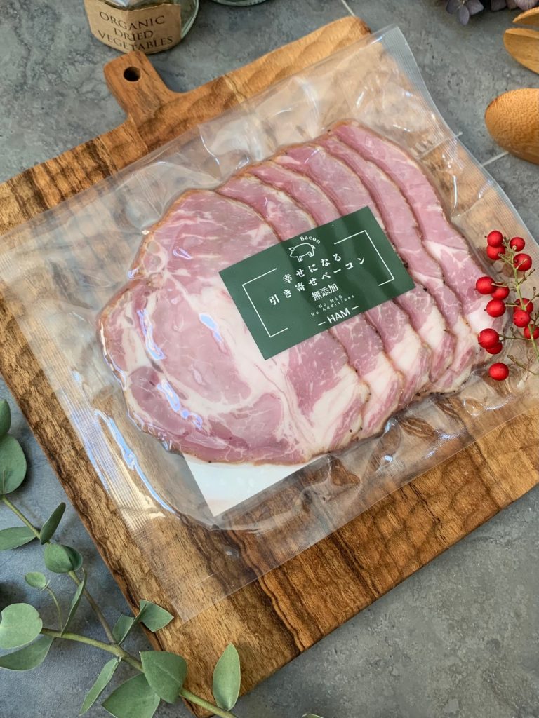 厳選された国産豚肉と天然の塩、香辛料のみを使用し、無添加にこだわって手作りしています。じっくりと時間をかけて熟成させ、自然の旨味を最大限に引き出した一品です。化学調味料や保存料を一切使わない、安心で安全なベーコンをお届けします。